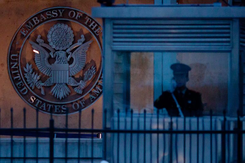 (Photo: A paramilitary guard stands in a booth outside the US embassy in Beijing on April 28, 2012. By Ed Jones/AFP/Getty Images.)