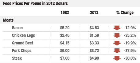 We now spend a much bigger share of our grocery money on processed foods, which includes things like frozen dinners, canned soups and snacks. We spend much less on meat, largely because meat is much cheaper than it was 30 years ago.
