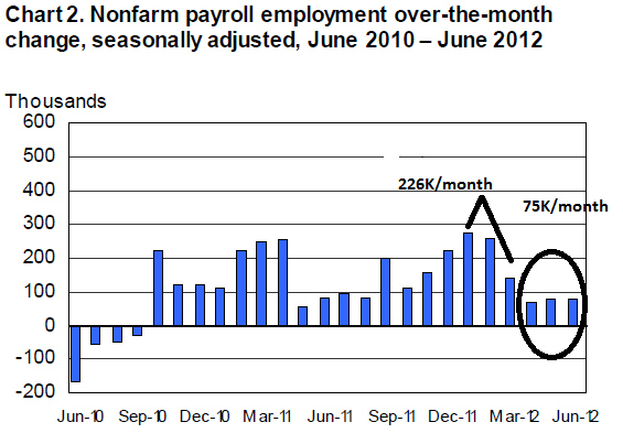 [W]ith revisions we have 80,000 jobs in June; 77,000 jobs in May; and 68,000 in April. Three makes a trend is the rule of journalism, so that is definitely a new weak trajectory for job growth. You'd need about 200,000 new jobs a month to be making meaningful progress toward reducing the unemployment rate. The good news, such as it is, is that the trajectory is upwards. That's visible in the headline jobs numbers and in the fact that both wages and hours worked went up in the June report. But I think it's clear that we're settling on a no-recovery path.