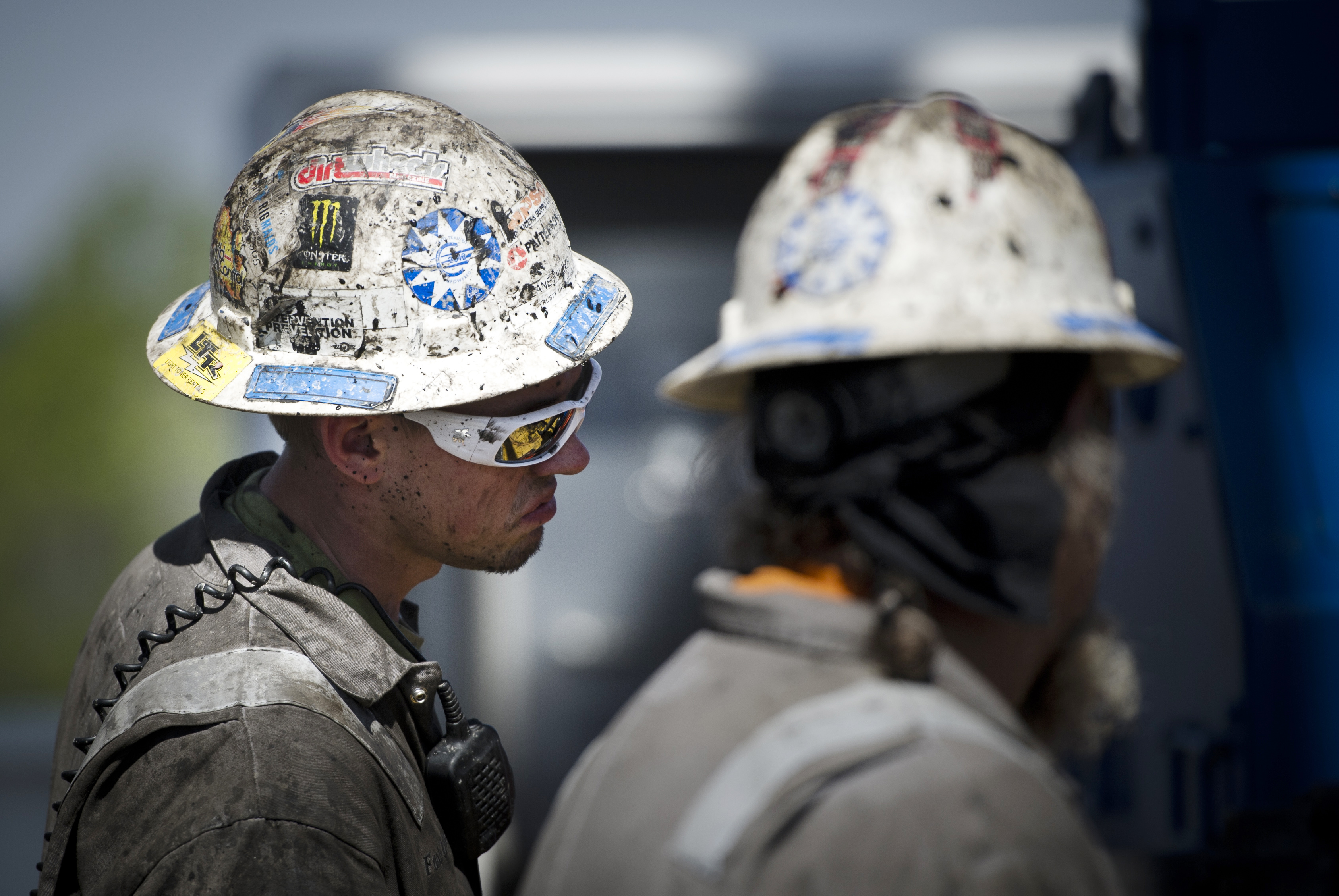 (Photo: US-Energy-Gas-Environment Workers chat at Consol Energy Horizontal Gas Drilling Rig exploring the Marcellus Shale outside the town of Waynesburg, PA on April 13, 2012. It is estimated that more than 500 trillion cubic feet of shale gas is contained in this stretch of rock that runs through parts of Pennsylvania, New York, Ohio and West Virginia. Shale gas is natural gas stored deep underground in fine-grained sedimentary rocks. It can be extracted using a process known as hydraulic fracturing – or 'fracking' – which involves drilling long horizontal wells in shale rocks more than a kilometre below the surface. Massive quantities of water, sand and chemicals are pumped into the wells at high pressure. This opens up fissures in the shale, which are held open by the sand, enabling the trapped gas to escape to the surface for collection. By Mladen Antonov/AFP/Getty Images)