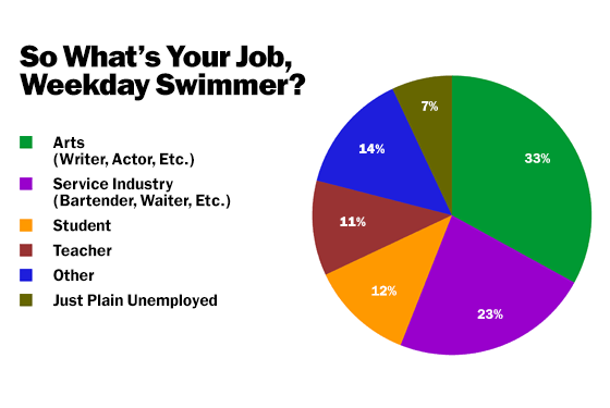 The above graph illustrates a survey of 100 weekday attendees of the newly reopened McCarren pool in Williamsburg, Brooklyn: