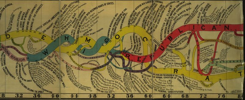 Susan Schulten found a fascinating timeline, created in 1880, of American political party history up to that point. She explains the above image: