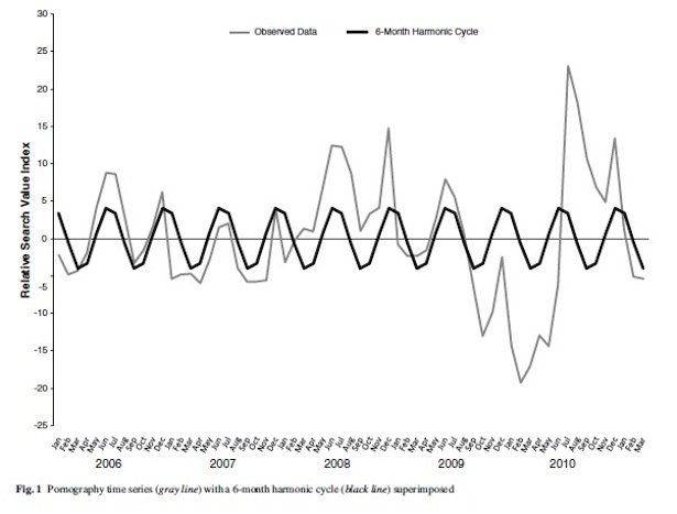 According to a paper just published in the Archives of Sexual Behavior, Internet pornography — like so many storms, like so much kale — is seasonal. Porn's peak seasons? Winter and late summer. Researchers at Villanova examined the Google trends for such commonly-searched-for terms as "porn," "xxx," "xxvideos" … and other, more descriptive phrases that, because I am looking at a portrait of James Russell Lowell as I write this, I will let you look up in the paper itself. Once they'd gathered those terms, the authors examined them in Google Trends. And what they found was a defined cycle featuring clear peaks and valleys — recurring at discernible six-month intervals.