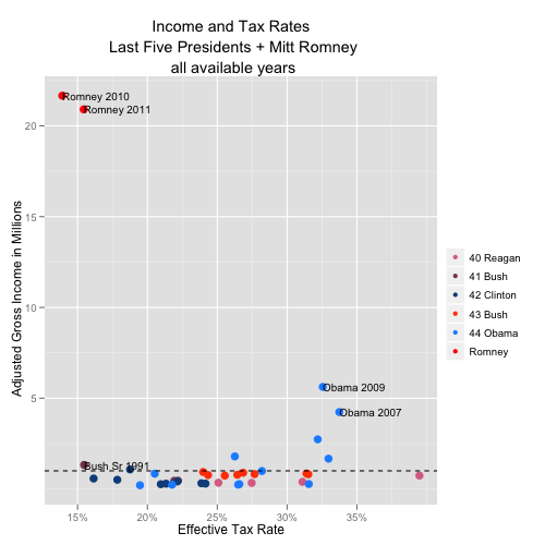 This scatter plot highlights two things: First, the two highest income years we observe are Romney 2011 ($21.6 million) and Romney 2010 ($20.9 million). Nobody else comes close. The next closest are Obama 2009 ($5.5 million) and Obama 2007 ($4.1 million).