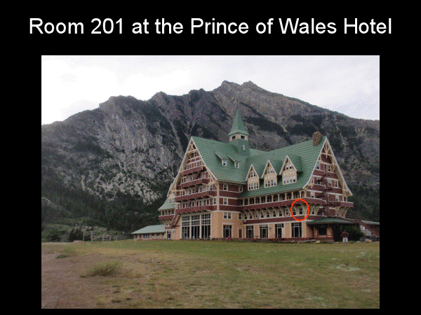 The hotel is situated high on a bluff overlooking the end of Waterton Lake, and it’s reputedly one of the windiest places in Canada. The hotel is held down by cables so it won’t shift in the high winds, and we could hear the wind whistling through the room even with the windows closed. Certainly the most scenic view ever out of a hotel room for my wife and me.
