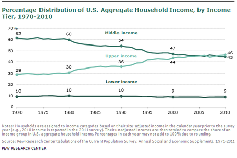 [I]n 1970, the middle class held 62 percent of the income in the country. The upper income held 29 percent. Those numbers have now flipped: The middle class is at 45 percent and the upper income class is at 46 percent.