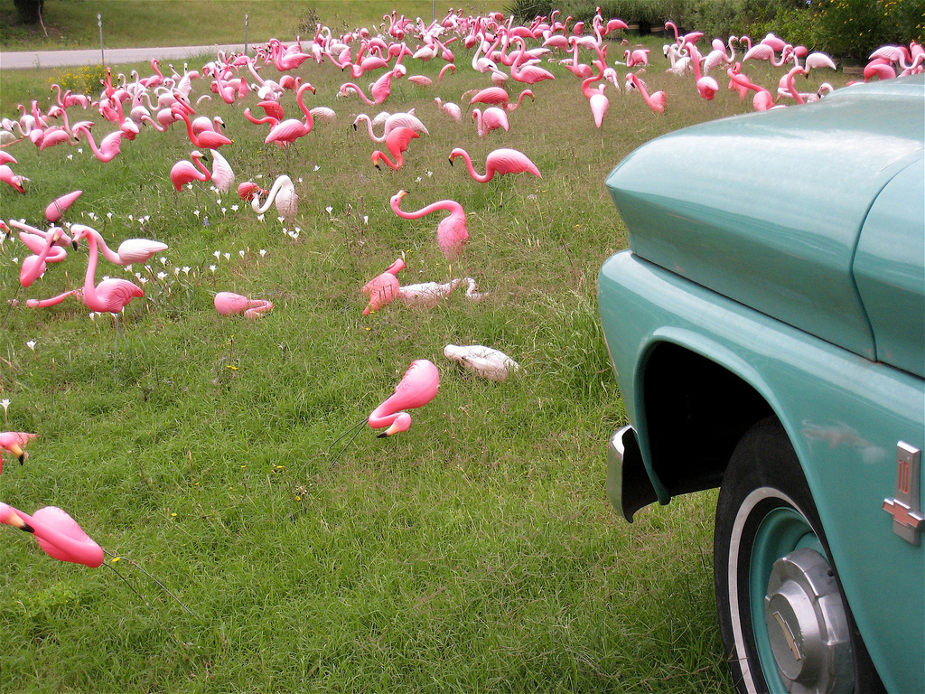 (Photo: A flock of flamingos at the junction of Bee Caves Road and Capital of Texas Highway by Alan Levine. Update from a reader: "I hate to be a grammar dork, but a flock of flamingos is called a flamboyant. I have a three- and four-year old and live by the zoo so I get to learn all kinds of fun animal facts.") Another reader: