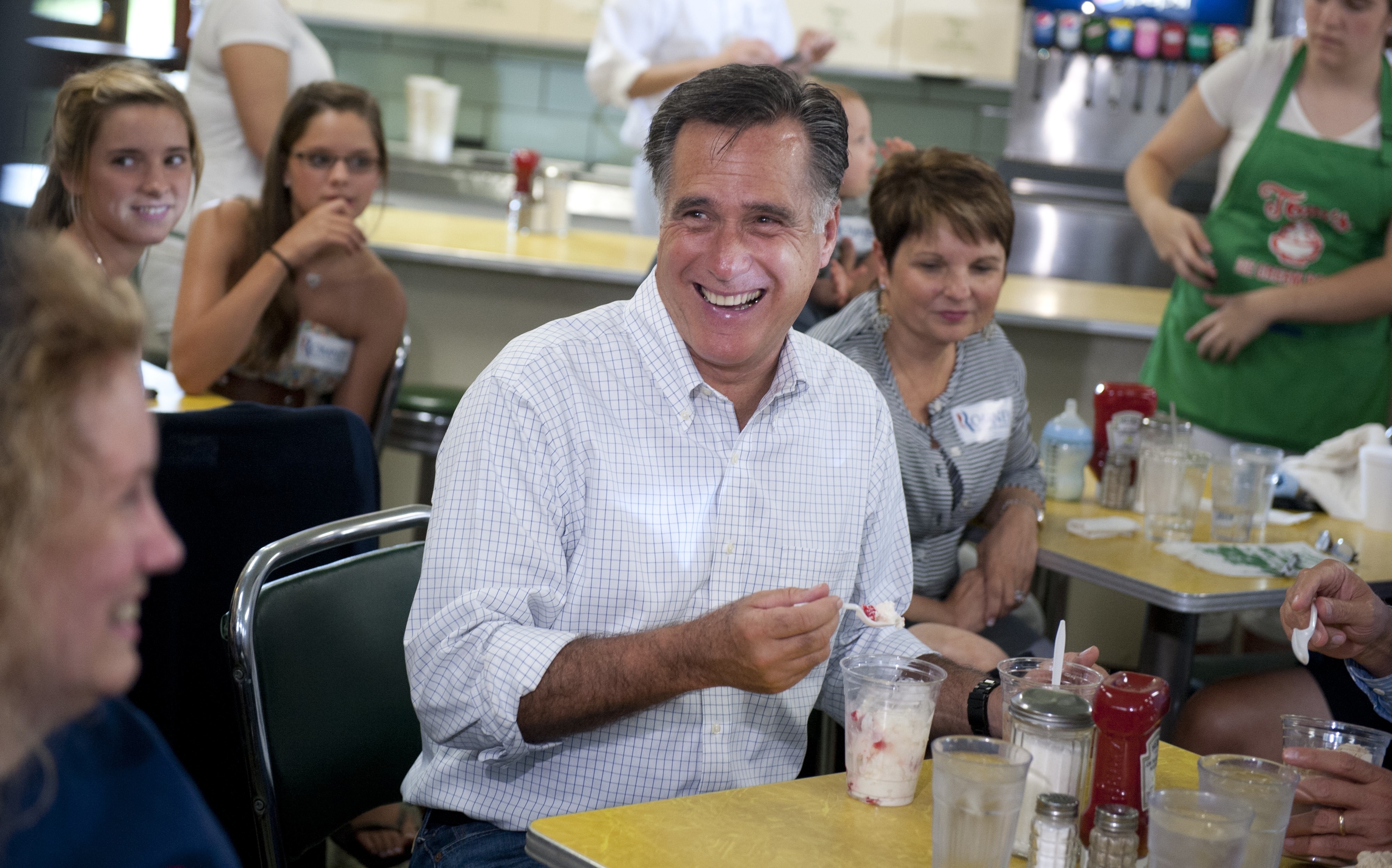 (Photo: US Republican presidential candidate and former Massachusetts Governor Mitt Romney eats ice cream at a campaign stop at Tom's Ice Cream Bowl in Zanesville, Ohio, on August 14, 2012. By Saul Loeb/AFP/Getty Images)