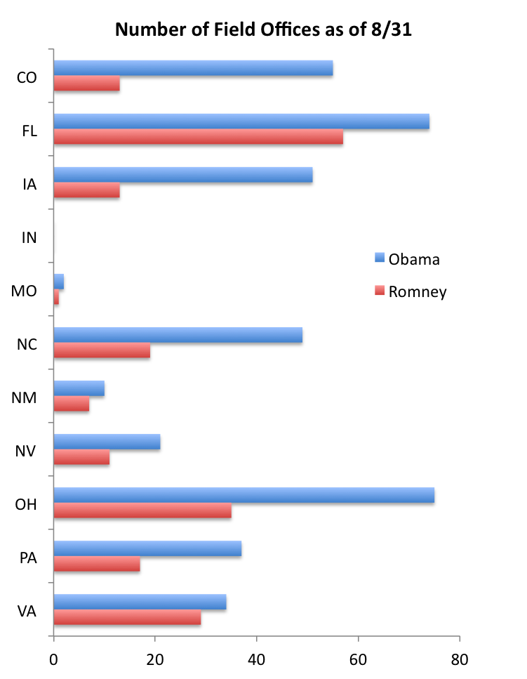 I had figured earlier that these differences were a result of the fact that Obama just had an early head start while Romney was still slugging it out in the primaries, but by this late date, I'm not so sure. It seems more like the campaigns have different philosophies when it comes to deploying campaign resources, with the Romney folks believing they can win in the air and the Obama folks believing this will be won on the ground.