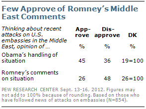 On Monday, Pew released public opinion data on the candidates' responses to the embassy violence: