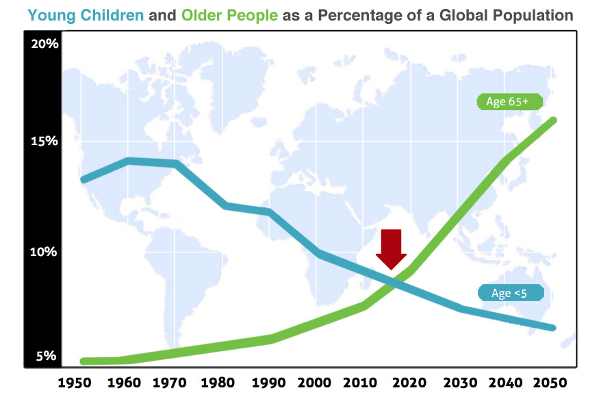[Gerontologist Michael Birt] describes a favorite graphic of his, derived from a 2007 United Nations publication. He calls it “Solving for X” because of the problem it raises for the world’s health-care systems. Two lines are crossing, the percentage of people over 65 and the percentage under 5. Back in 1950, children predominated in the world; in 2050 the seniors will be on top. “The percent over 65 and under 5 are trading places,” Birt says. “We’re almost at the X spot.” The forecast date for global X to occur is 2017, but each country will arrive at the transition at a different time. “Japan blasted through its intersection years ago,” he notes.