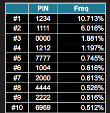 In my dataset the answer is 8068 with just 25 occurrences in 3.4 million (this equates to 0.000744%, far, far fewer than random distribution would predict, and five orders of magnitude behind the most popular choice). Warning: Now that we’ve learned that, historically, 8068 is (was?) the least commonly used password 4-digit PIN, please don’t go out and change yours to this! Hackers can read too! They will also be promoting 8068 up their attempt trees in order to catch people who read this (or similar) articles.