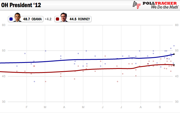 This morning’s Washington Post poll found Obama leading Romney by 8 points in the Buckeye State. That’s on the high end of recent margins, but the trend is unambiguously in the president’s favor: Obama was up 5 in an Ohio Newspaper Organization poll, up 4 in a Purple Strategies poll, and up 7 in a Fox News poll and an NBC News/Wall Street Journal/Marist College Poll. That’s all in the last two weeks.