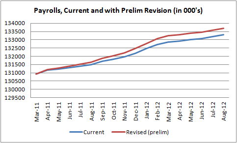 [T]he preliminary benchmark revision to the payroll jobs survey showed that as of March of this year, employers added 386,000 more jobs than we thought (453K in the private sector)…. So, good to know we’ve had a bit more momentum on the jobs front, though obviously we’re still way behind where we need to be to tighten up the job market.