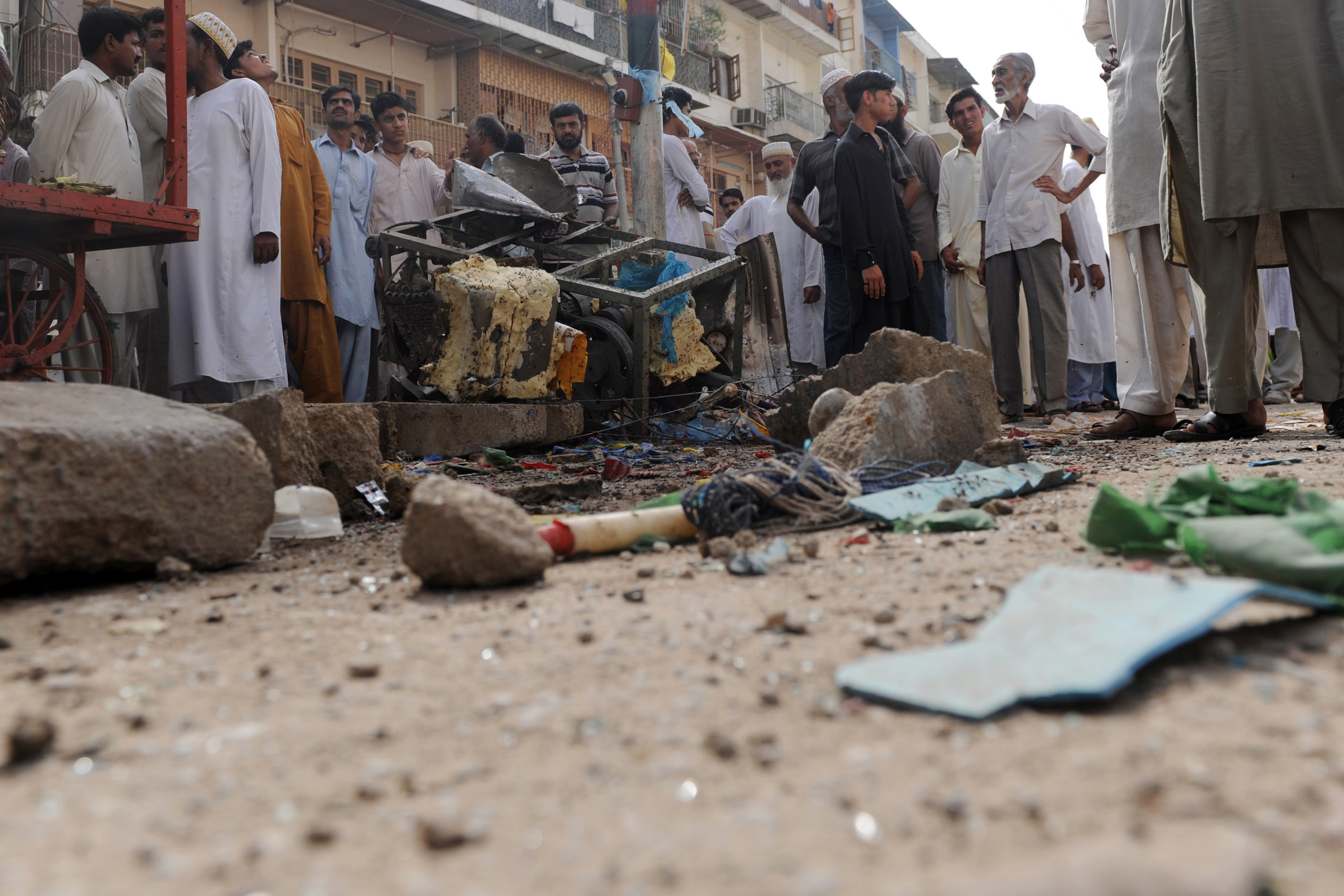 (Photo: Local residents gather at the site of an overnight bomb explosion in Karachi on September 19, 2012. The death toll from twin bomb blasts in Karachi rose to seven as police said they suspected the attack was targeted at members of a minority Muslim sect. By Rizwan Tabassum/AFP/Getty Images)