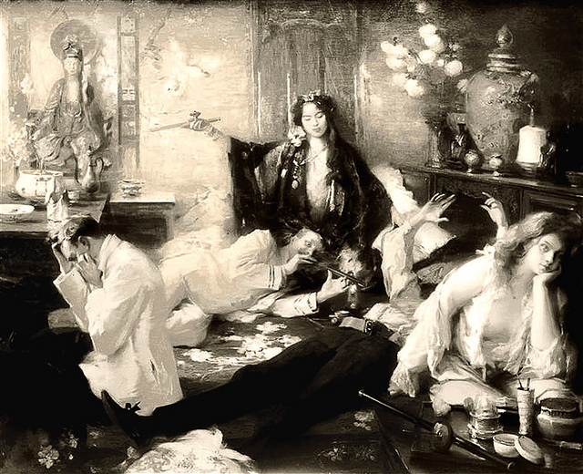 Then a Chinese inventor whose name is completely lost to history came up with a system for vaporizing it. That invention opened the door for opium to become a recreational drug. Suddenly, all the bad side effects were lessened. Vaporizing opium takes out a lot of the morphine content, which is the thing that makes you feel stupefied and out of it. Good-quality opium, smoked with the proper accoutrements, is energizing. It doesn’t put you on the floor. Well, you’re lying on the floor to do the actual smoking, but that’s just because it’s the most comfortable position to hold the pipe over the lamp. That’s the only reason the old photographs of opium dens show people lying down. It wasn’t because it made them so stoned they couldn’t stand up.