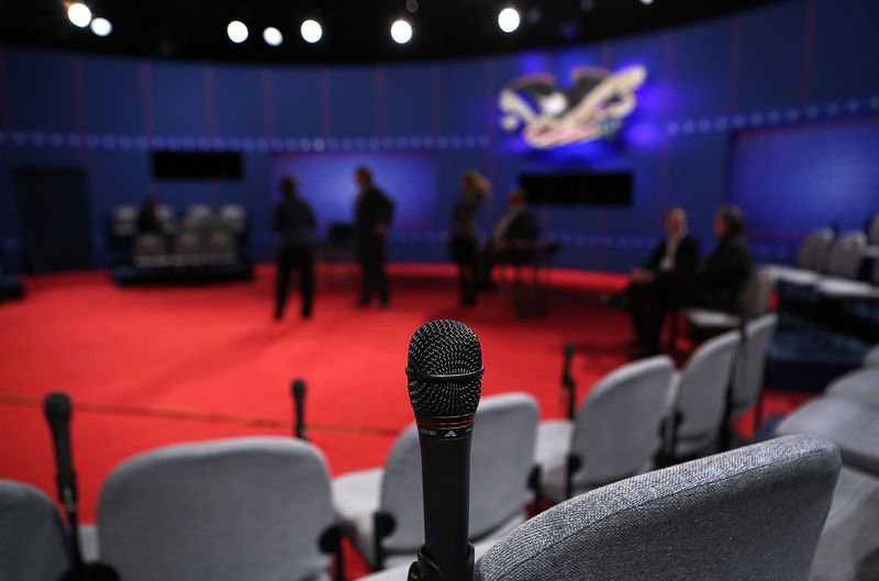 (Photo: Members of the production crew ready final preparations for the second presidential debate between U.S. President Barack Obama and Republican nominee Mitt Romney on October 16, 2012 in Hempstead, New York. The second presidential debate, a town-hall format with questions from the audience, will be held this evening at Hofstra University. By Win McNamee/Getty Images)