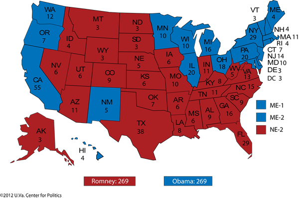 We don’t have a dog in this race, but we are rooting for one thing: no tie! A 269-269 Electoral College outcome would inevitably be a national crisis on par — or worse — with the 2000 Florida cliffhanger, especially if Romney lost the popular vote.