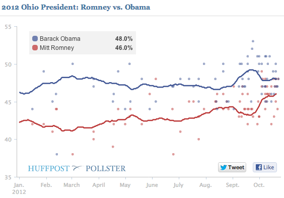 Over the last four years, Obama's support among white voters has fallen to historically low levels nationally, predictably rejiggering the battleground states along racial lines. But the wave has completely missed Ohio, where Obama continues to hold a slight lead in a traditionally Republican, white working class state that only voted for him by 4 points in 2008. Other than Florida, Obama couldn't have chosen a better state to defy demographic expectations than Ohio, and at the moment, it's responsible for his clear advantage in the Electoral College.