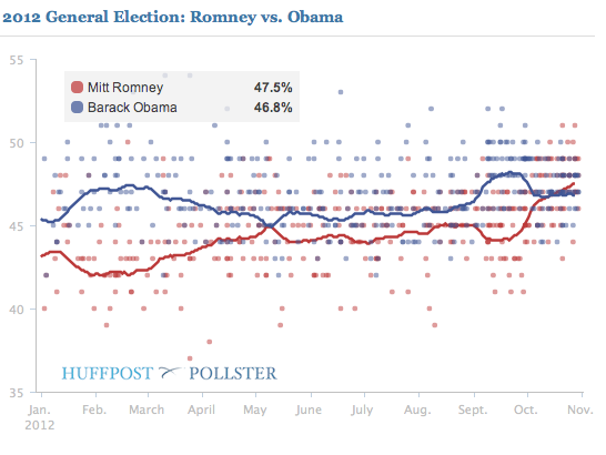 Yesterday, Georgia, California, Massachusetts, North Dakota, and Montana polls were all consistent with a national popular vote victory for the president. In particular, the California poll is especially important. Perhaps surprisingly, California has been one of Obama's weaker states since the first presidential debate, with several polls showing Obama ahead by 12 to 15 points. In 2008, Obama won California by 24 points and 3 million votes–dropping off 9 to 12 points in California would cut his share of the popular vote by 2 percentage points. Given the diversity of the state, such a large drop-off would be very surprising, even if low Hispanic turnout could plausibly explain some of the decline.