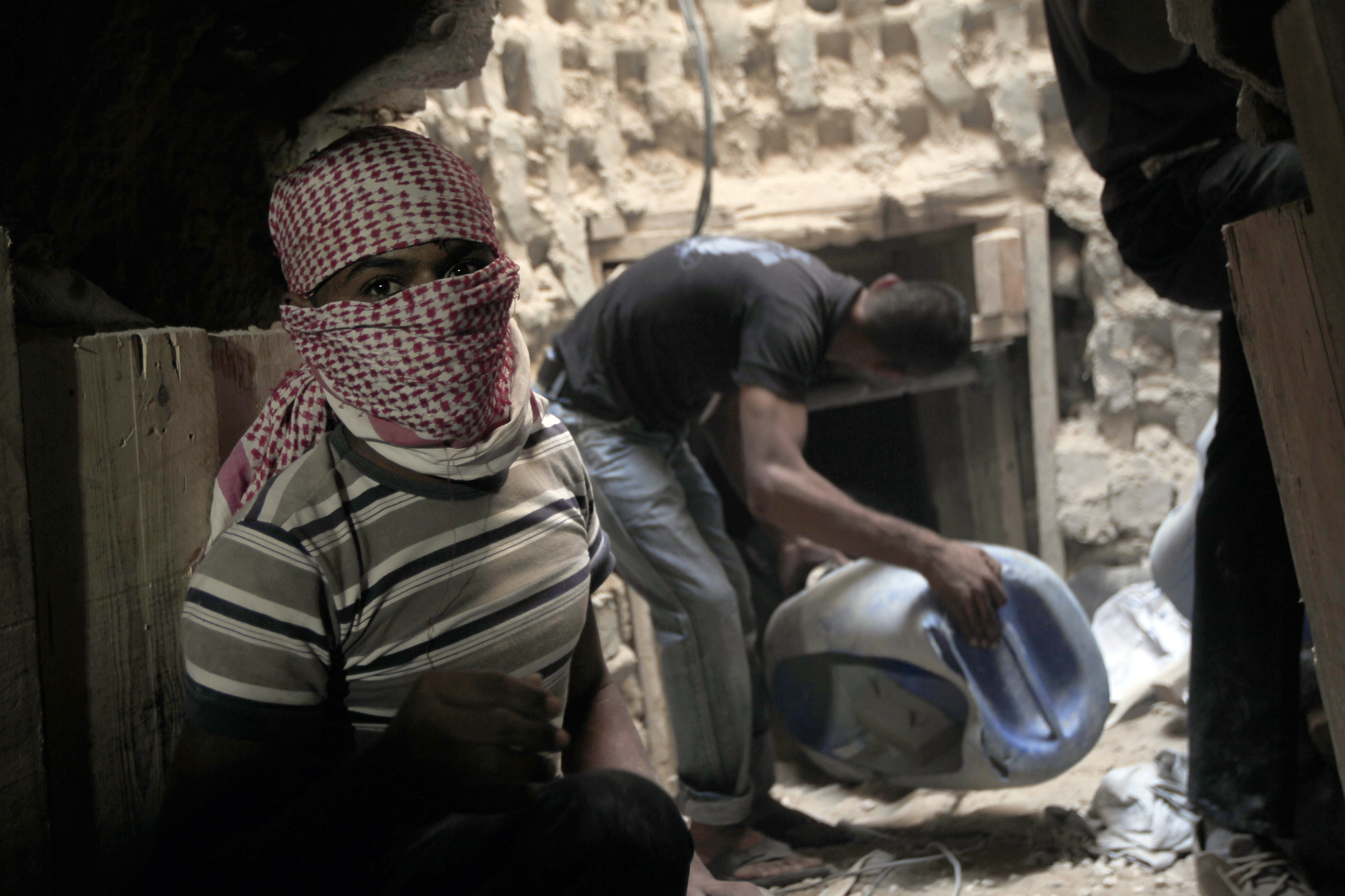 (Photo: A Palestinian smuggler is seen at the entrance of a tunnel along the Gaza-Egypt border in Rafah, on October 4, 2012. The tunnels are a vital lifeline for supplies of food, clothes, building materials and fuel into the impoverished Palestinian territory subjected to an Israeli blockade since 2006. By Said Khatib/AFP/Getty Images.)