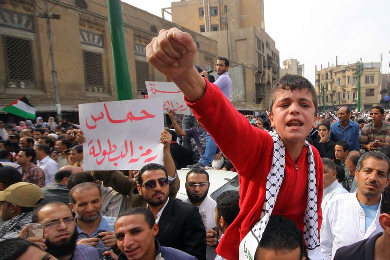 (Photo: Egyptians shout anti-Israeli slogans during a demonstration in front of Al-Azhar mosque after the weekly Friday prayer in Cairo on November 16, 2012. Several thousand people demonstrated outside the Al-Azhar mosque to protest against the Israeli campaign. Arabic writing on placard reads 'Hamas is the symbol of heroism'. By AFP/Getty Images)