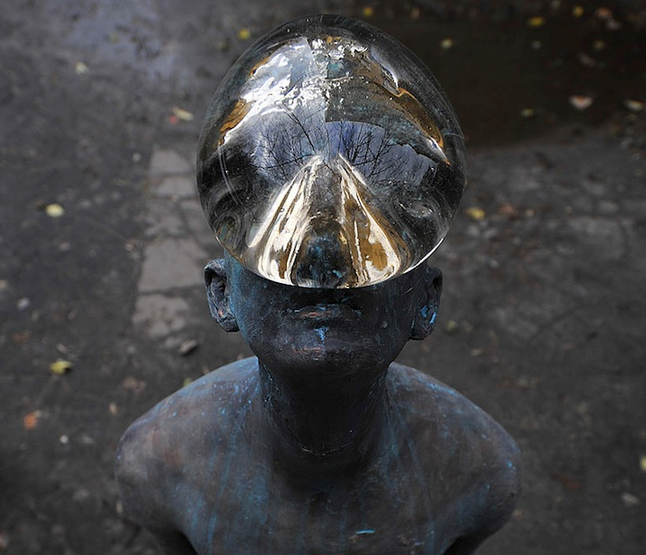 Ukrainian artist Nazar Bilyk created this stunning 6-foot tall sculpture called "Rain" using bronze and glass. A huge raindrop stands suspended on the figure's face as he looks up toward the sky. The work has several meanings including representing man's delicate relationship with nature.
