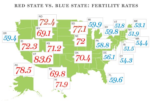 Stunningly, the postponement of marriage and parenting — the factors that shrink the birth rate — is the very best predictor of a person’s politics in the United States, over even income and education levels, a Belgian demographer named Ron Lesthaeghe has discovered. Larger family size in America correlates to early marriage and childbirth, lower women’s employment, and opposition to gay rights — all social factors that lead voters to see red.