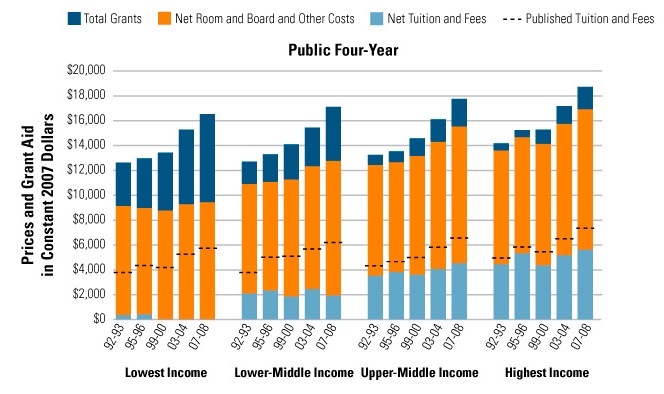 Wealthier families now pay more than ever to send their children to college. But for much of the middle class, the real net cost of college has not changed significantly; for much of the poor, the expansion of aid has increased the accessibility and affordability of a college education. Data from the College Board show effectively no change in real net tuition and fees for dependent students at four-year public or private universities whose families are in the lower-two income quartiles. There also have been some increases in the real cost of room and board, but for families with below-average income, the rise has been on the order of 20 percent over 20 years.