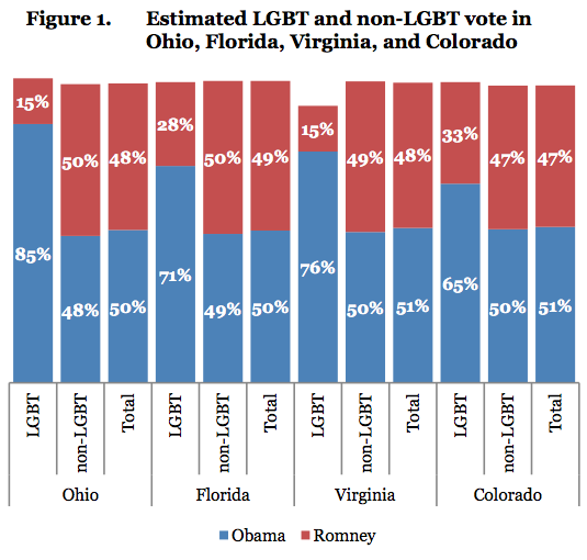 Had LGBT voters not cast their ballots in Ohio and Florida, Governor Romney would have won those states. If the LGBT vote in Virginia had been less lopsided in President Obama's favor and more evenly split between the two candidates, Governor Romney would have also won that state.