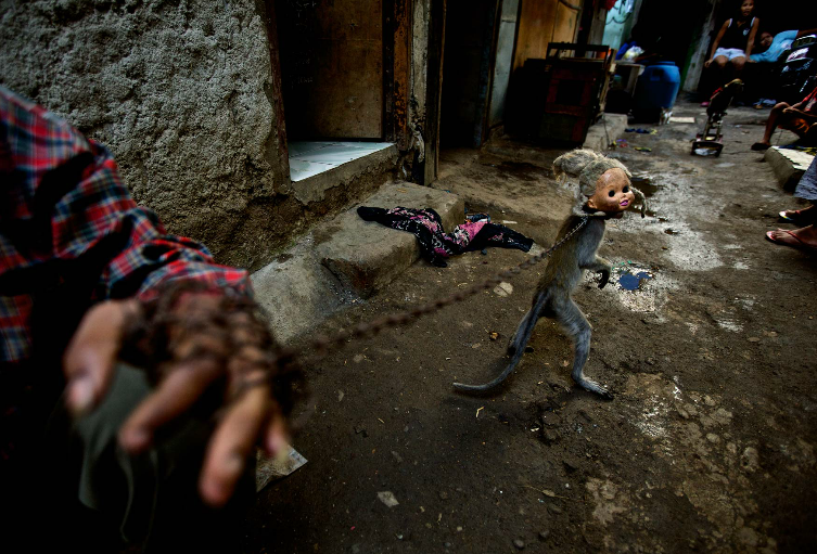 For his series Monkey Town, Ed Wray photographed Topeng Monyet (performing monkeys) and their handlers in Jakarta. Many handlers would put baby doll heads on their moneys as masks. He discusses the project with Greta Rybus: