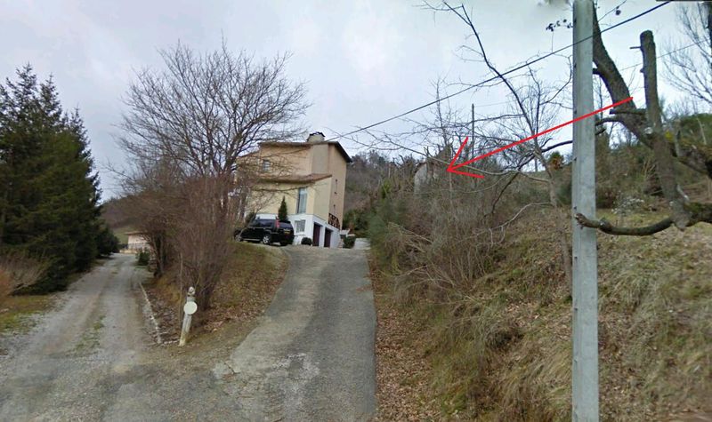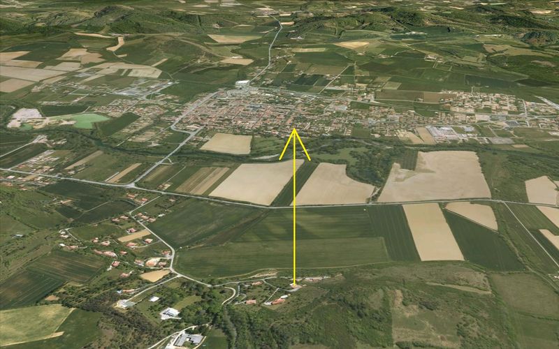 Looking at the cypress trees and the building in the foreground one might guess that this is Italy, but the church steeple and the mountains in the rear point squarely to the Pyrenees. This week’s view shows the medieval town of Mirepoix, France. The view looks south, south east from a building about half a mile outside of town, just off of the D106 road. Oh, and that pole with the blue net leaning against the railing? It’s a pool skimmer, with the pool deck lying just out of sight below your viewer’s window. Images of overhead and bird’s eye views are attached, as well as a partial shot of the viewer’s building marked with a red arrow: