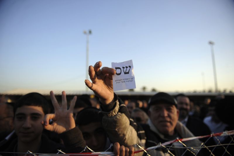 (Caption: A man holds up a voting bill for the ultra-Orthodox Shas party during the annual pilgrimage to the grave of Rabbi Baba Sali in the southern Israeli town of Netivot on January 14, 2013. By David Buimovitch/AFP/Getty Images)