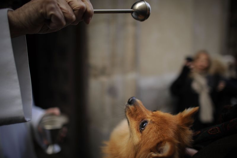 A dog is blessed by a priest at San Anton church in Madrid on Saint Anthony’s Day, on January 17, 2013. Dogs, cats, rabbits and even turtles, many dressed in their finest, trooped into churches across Spain in search of blessing on Saint Anthony’s Day, the patron saint of animals. By Pedro Armestre/AFP/Getty Images.