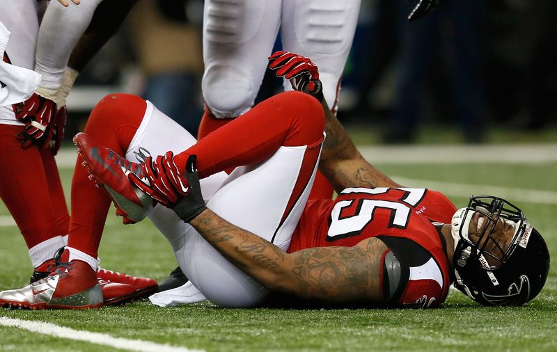 (Photo: John Abraham #55 of the Atlanta Falcons reacts after injuring his leg against the Tampa Bay Buccaneers at Georgia Dome on December 30, 2012 in Atlanta, Georgia. By Kevin C. Cox/Getty Images)