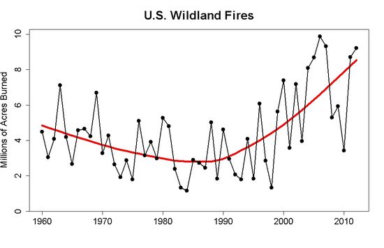 During his inauguration, Obama cited “raging fires” as evidence of climate change. George Will protests that there “were a third fewer U.S. wildfires in 2012 than in 2006.” Joe Romm chides Will and the WaPo for taking the data out of context: