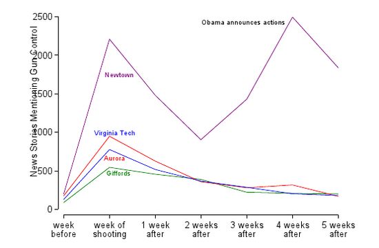 Even before the 27 victims had been laid to rest, gun control was a far more prominent part of the Newtown narrative than it had been in previous incidents. And in contrast to the Virginia Tech, Aurora and Giffords shootings, it has come to dominate the media narrative. The week that Obama issued the executive actions, more than 60 percent of stories that mentioned Newtown also included a reference to gun control.