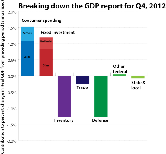 The budget “sequestration” will lop more than a trillion dollars of spending cuts out of the economy, creating similar effects as we saw this last quarter. The Obama administration had hoped the threat of these cuts, half of which come out of defense, would force Republicans to compromise on some kind of long-term deal that would eliminate all the short-term austerity and replace it with gradual, long-term deficit reduction. But that seems unlikely to happen.