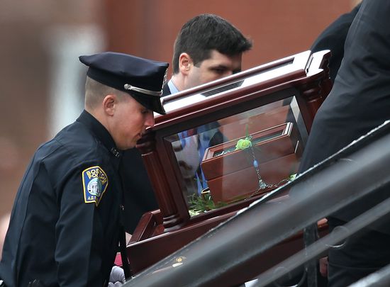 (Photo: A Boston Police officer was one of the pallbearers who helped carry the cremated remains of Hamilton police officer Kenneth Nagy at a funeral mass held at St. James Roman Catholic Church. Nagy committed suicide after a shooting in Beverly of a Beverly police officer who worked with his wife. By John Tlumacki/The Boston Globe via Getty Images.)