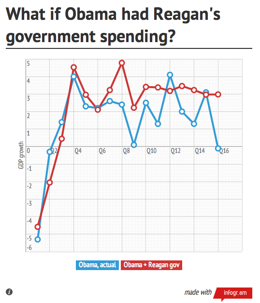 [T]hese graphs simply establish a basic fact about Obama’s term: While deficits have indeed been high, government spending and investment has been falling since 2010. This is, in recent presidential administrations, a simply unprecedented response to a recession. Just for fun, I took Obama’s GDP growth, netted out the effect of government spending and investment, and then added the total government spending and investment numbers — which include state and local government — from Reagan’s first term. The result is a significantly better economy, with growth since 2010 averaging 3.2 percent rather than 2.4 percent.