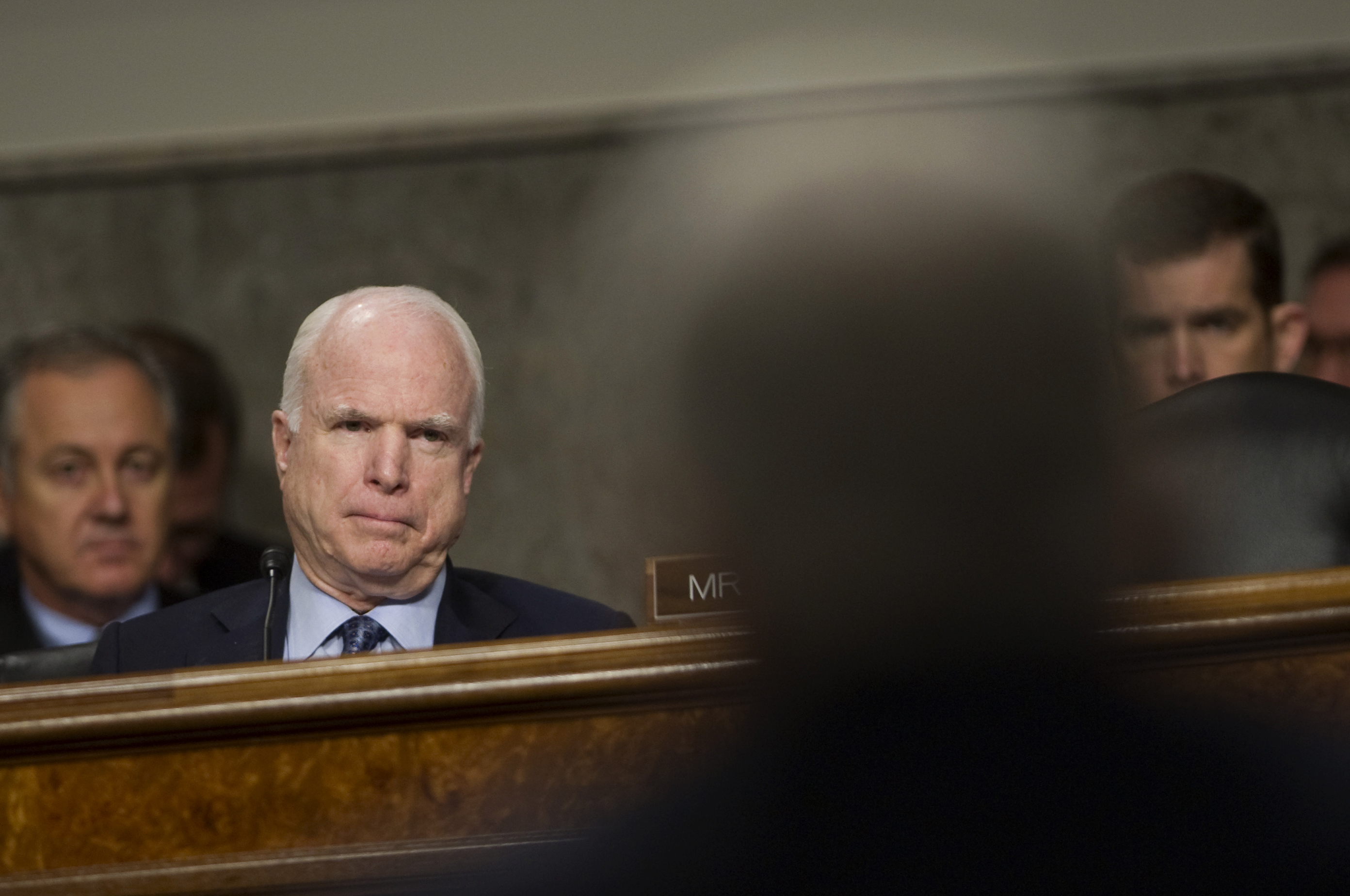 (Photo: Sen. John McCain, R-Ariz., questions former Sen. Chuck Hagel, R-Neb., at a Senate Armed Services Committee hearing on Hagel’s nomination to be Secretary of Defense. By Chris Maddaloni/CQ Roll Call/via Getty.)