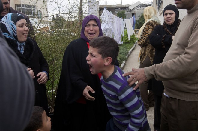 Members of a Palestinian family react after Israeli bulldozers demolished their family house in the Arab east Jerusalem neighborhood of Beit Hanina on February 5, 2013. Palestinian homes built without a construction permit are often demolished by order of the Jerusalem municipality. AFP PHOTO/AHMAD GHARABLI (Photo credit should read AHMAD GHARABLI/AFP/Getty Images)