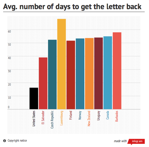 Not all are that great at it: Only 60 percent of the letters actually came back to the researchers. Among the countries that returned all 10 letters, the USPS was far and away the fastest to do so.
