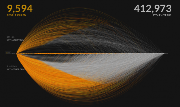 Information visualization firm Periscopic just published a thoughtful interactive piece on gun murders in the United States, in 2010. It starts with the individuals: when they were killed, coupled with the years they potentially lost. Each arc represents a person, with lived years in orange and the difference in potential years in white.