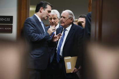 WASHINGTON, DC – JANUARY 31: Senate Armed Services Committee member Sen. Ted Cruz (R-TX) (L) talks with committee Chairman Carl Levin (D-MI) (R) as they and former U.S. Senator Chuck Hagel (R-NE) arrive for Hagel’s confirmation hearing to become the next secretary of defense on Capitol Hill January 31, 2013 in Washington, DC. President Barack Obama nominated Hagel, a controversial choice as Hagel opposed former President George W. Bush and his own party on the Iraq War and upset liberals with his criticism of a gay ambassador, for which he later apologized. (Photo by Chip Somodevilla/Getty Images)