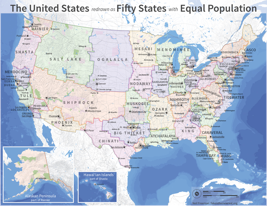 The fundamental problem of the electoral college is that the states of the United States are too disparate in size and influence. The largest state is 66 times as populous as the smallest and has 18 times as many electoral votes. This allows for Electoral College results that don’t match the popular vote. To remedy this issue, the Electoral Reform Map redivides the fifty United States into 50 states of equal population. The 2010 Census records a population of 308,745,538 for the United States, which this map divides into 50 states, each with a population of about 6,175,000.