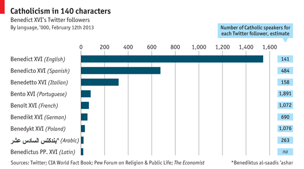 The Economist uses the Pope’s “linguistically notable” abdication – it was announced in Latin – to break down the languages used by Roman Catholics around the world: