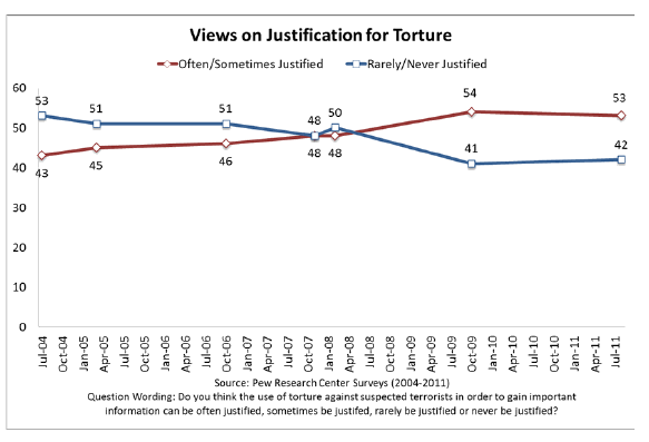 Can you see when public approval for torture begins to rise in the graph above? After Obama and Holder told us it was no big deal, and no one should be held in the slightest way accountable.