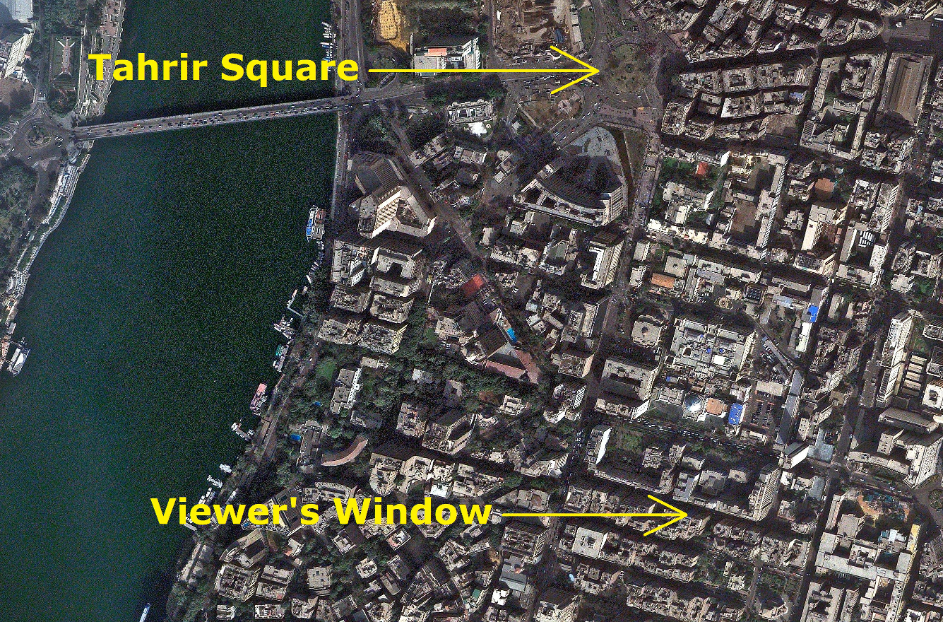 Attached is a labeled, high-resolution satellite view showing your viewer’s position in relation to Tahrir that was taken during the January 2011 revolution: