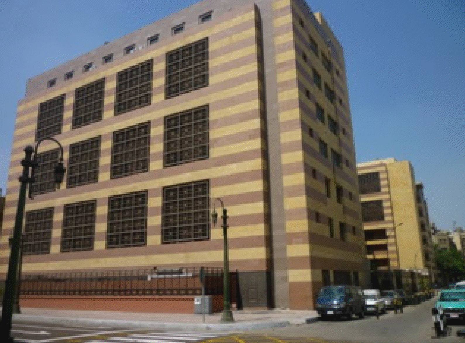 Aha! If only I had drawn that line the first time around it would have saved me an embarrassingly long time combing the city, because as it happens the tower in question fell right on it! The Banque Misr headquarters – satellite image attached, link here. Here it is from the front, I think.